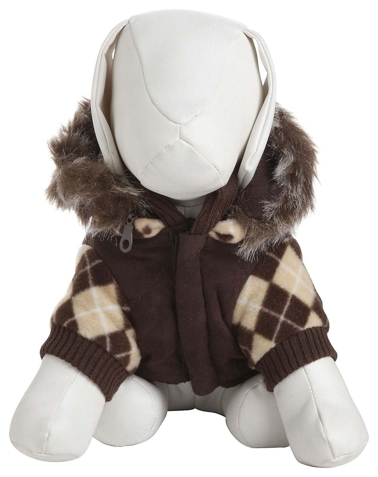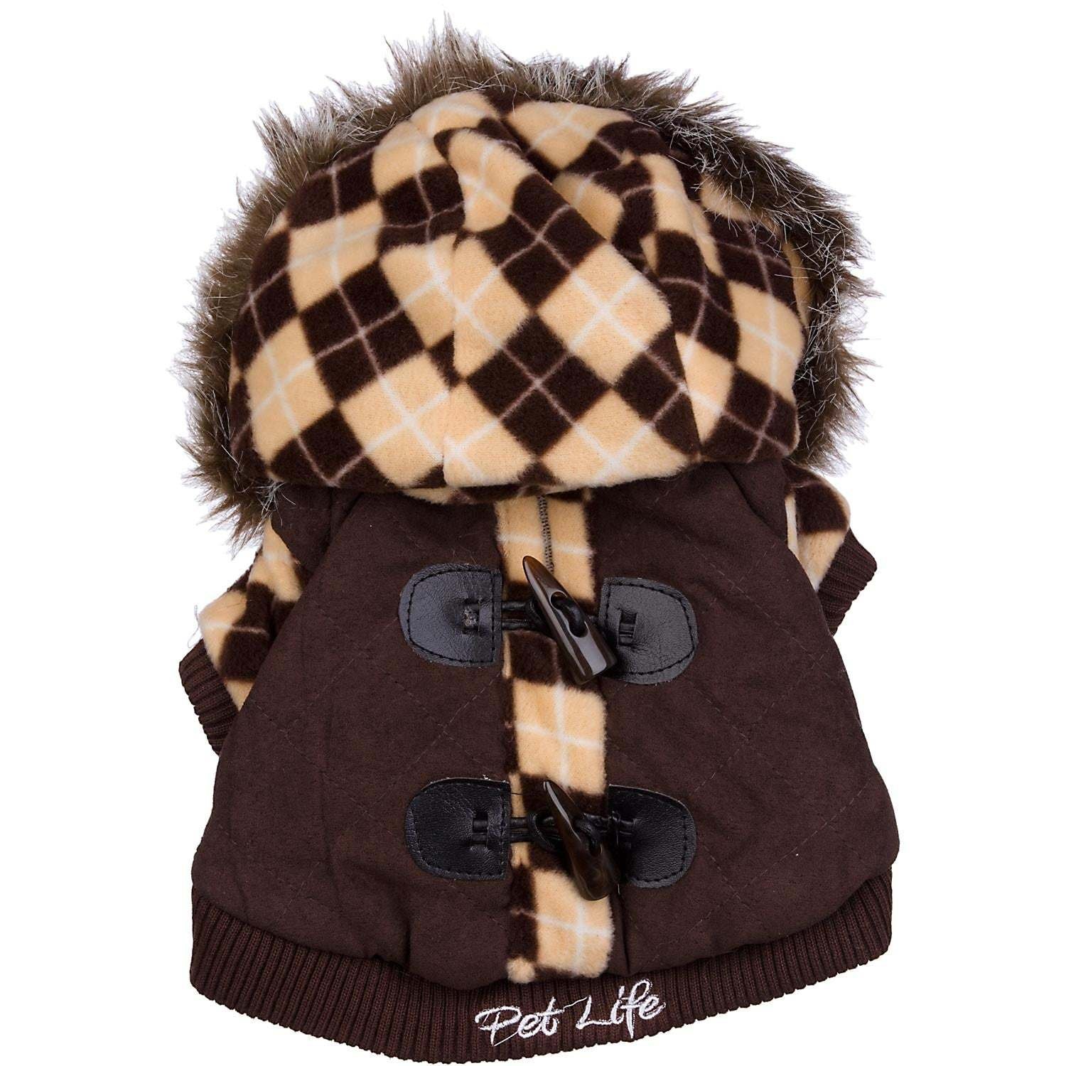 The Pet Life Designer Patterned 'Suede-Argyle' Sweater Dog Coat Jacket features Ultra-Trendy Fashion Rivets along the Backside and a Leash-Slit Holder behind the Neck-Area. This Jacket also Features an Argyle Patterned Fleece Removable Zippered Hood. Composed of Suede and Fleece and Features Thinsulate Thermal Insulation technology keeping your Pet Warmer during those Harsher colder climate weather conditions.