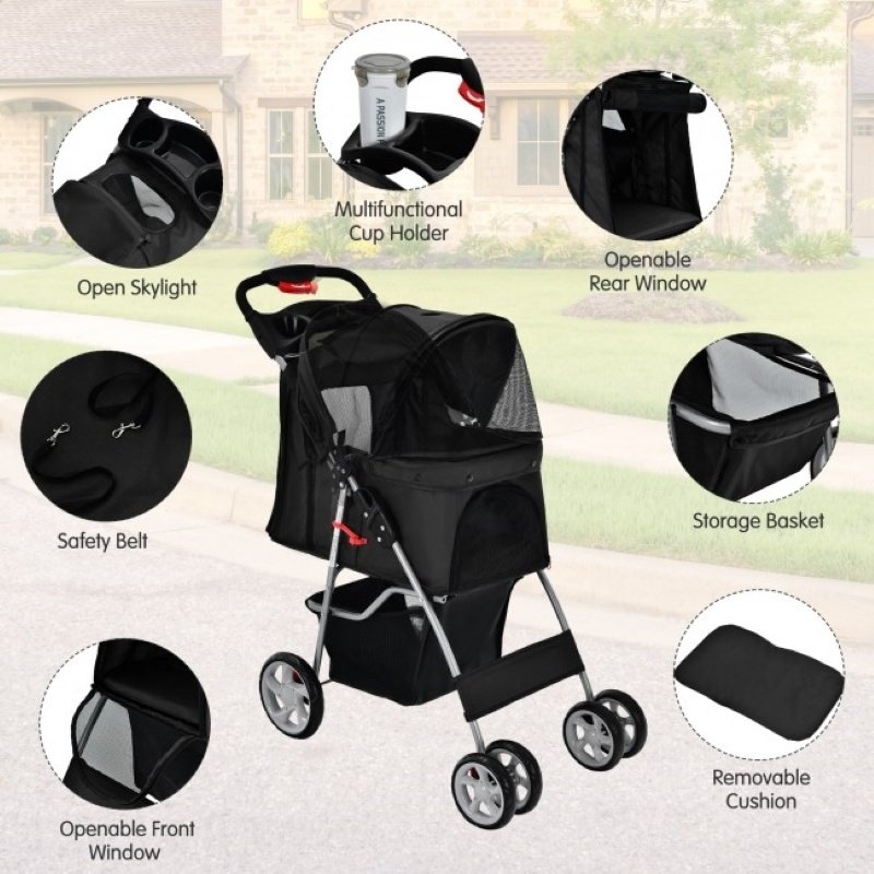 4 mesh windows provide good air ventilation and a great viewA smooth zipper allows you to remove the mesh if necessaryStable iron frame built for long-lasting service without deformation33 lbs large bearing capacity suitable for most small and medium petsThe one-hand simple mechanism makes it quick to fold the strollerA safety belt can prevent the pet from falling or running outEVA wheels with shock absorption make walking more effortlessThe extra pad inside the cart for added comfortAdjustable canopy to protect your pet from rain and sunLarge storage basket and storage bracket allow you to take all necessities with you and release your hands.